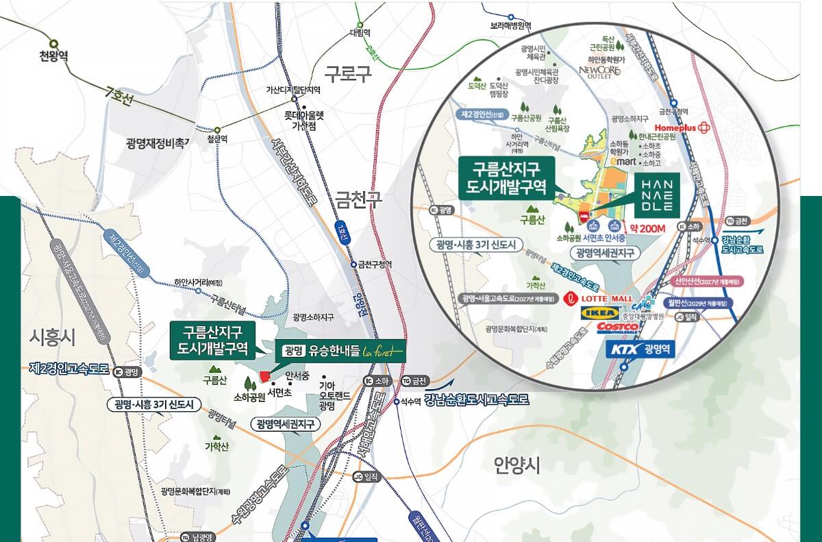 KTX 광명역 인근에 위치하고 수도권 지하철 1호선과 7호선이 가까워 대중교통 접근성이 뛰어납니다. 소하IC, 제2경인고속도로, 강남순환고속도로를 통한 촘촘한 도로망으로 강남권까지 20분 내 접근이 가능해, 서울 주요 도심으로의 이동 편의성이 우수합니다.